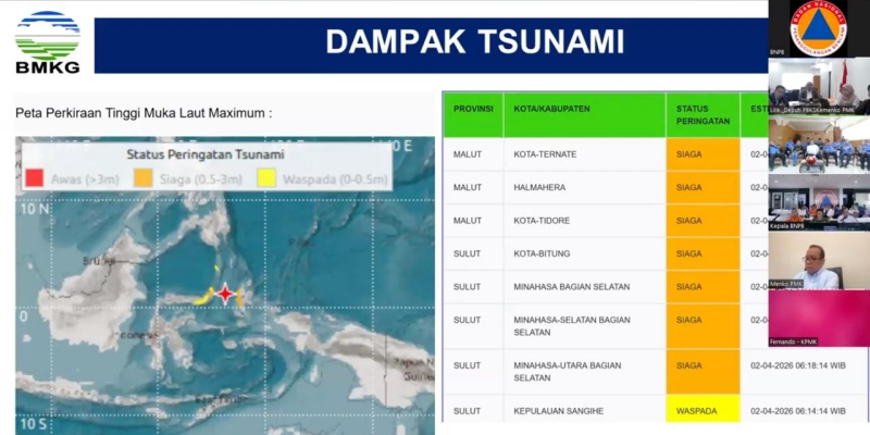 “Hasil analisis BMKG menunjukkan gempa ini berpotensi tsunami dengan status siaga di wilayah Ternate, Halmahera, Tidore, Bitung, dan sebagian Minahasa, serta waspada di Kepulauan Sangi dan sekitarnya,” ujar Faisal, Kamis (2/4/2026).